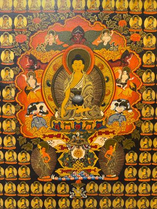 150 year old Tibetan Thangka painting, 1000 Buddha motif with other auspicious symbols, hand painted real gold leaf, with custom gallery frame