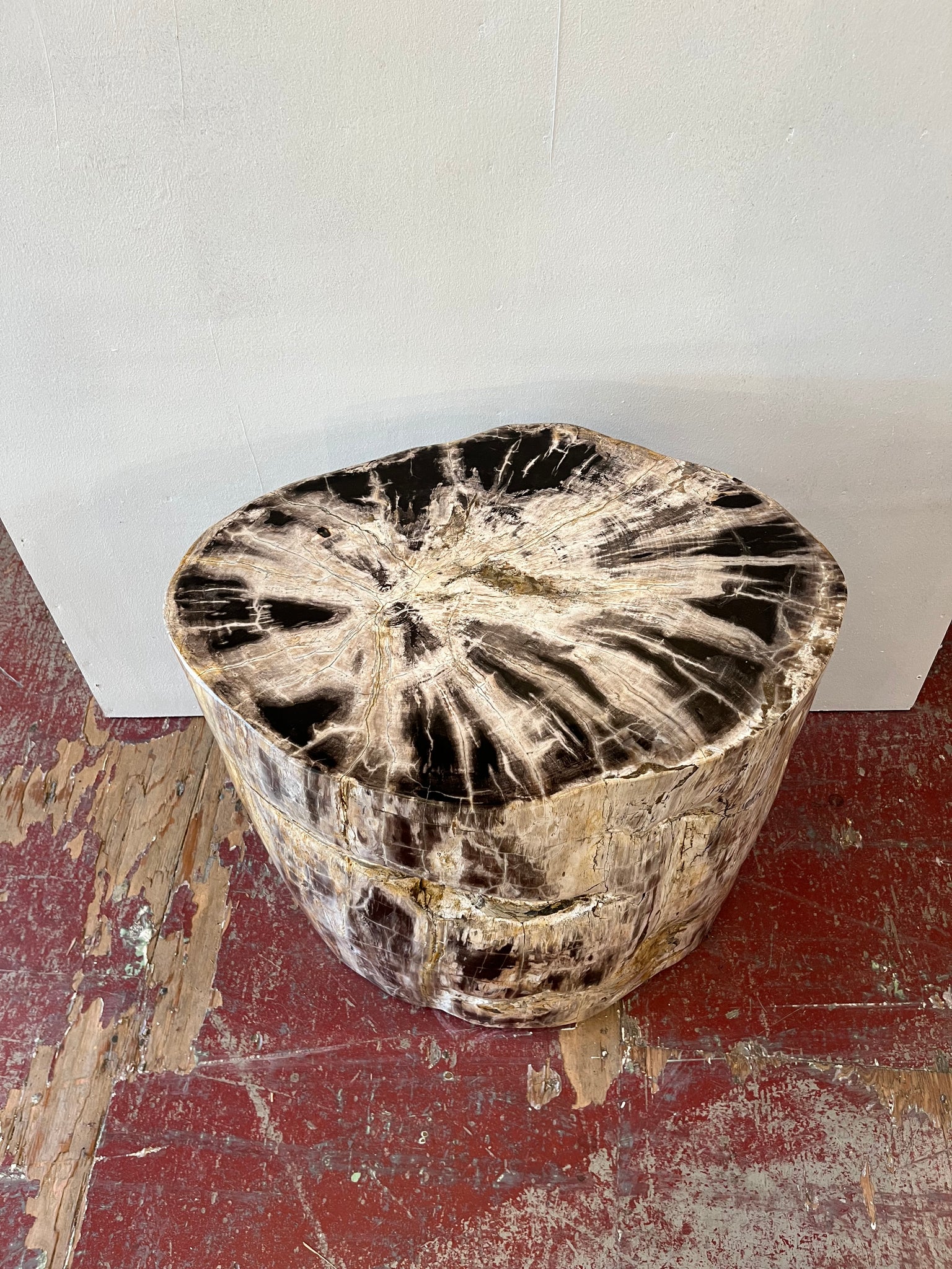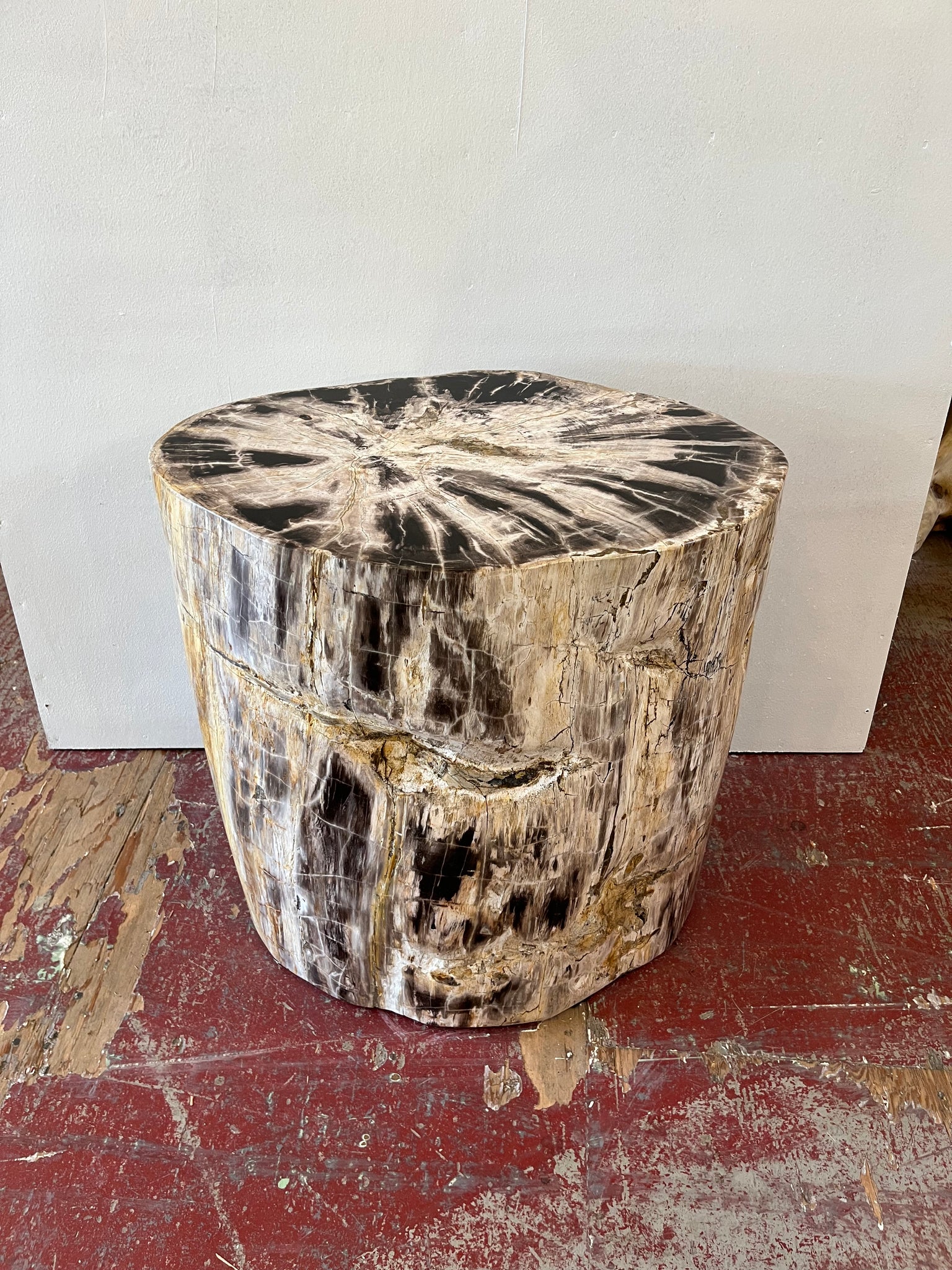 This stool is carved from a single piece of ancient petrified wood, polished to reveal stunning natural patterns of cream, black, and amber.