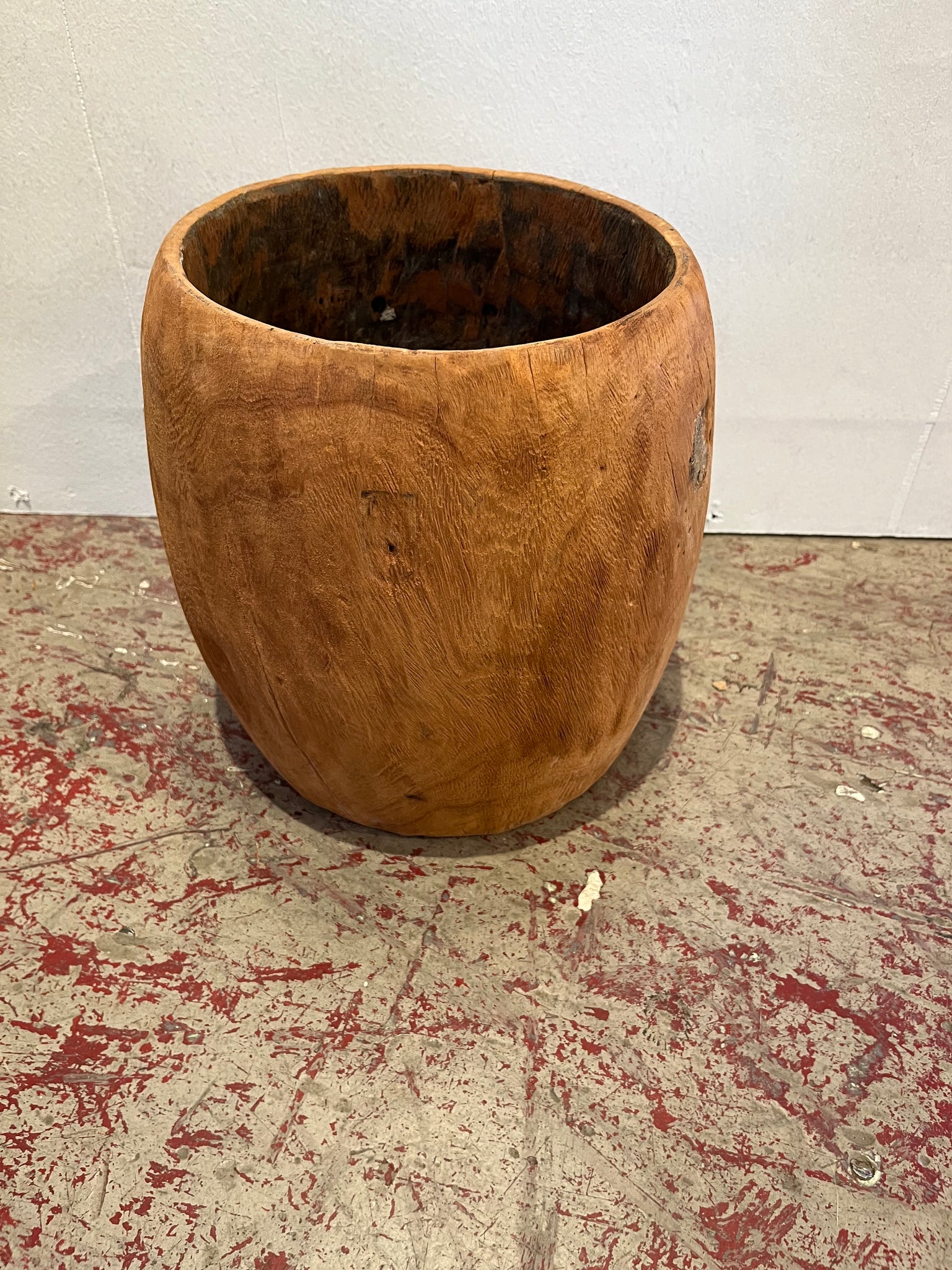 Hand-carved from solid teak, this small drum retains its natural warmth and grain. Its smooth, rounded form and aged interior give it an earthy character that works beautifully as a planter, vessel, or sculptural accent.